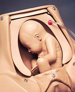 Full-term fetal baby with palpable fontanels, spine, shoulders, elbows, and knees. This fetal baby may be placed in normal, breech, or transverse positions. It is cradled between two “cushions” which may be inflated independently of each other - inflation of the lower cushion raises the fetus to the desired position; inflation of the upper cushion creates a firm abdomen as in the ninth month of pregnancy. This module will fit any Gaumard Advanced Childbirth Simulator purchased since 1989.